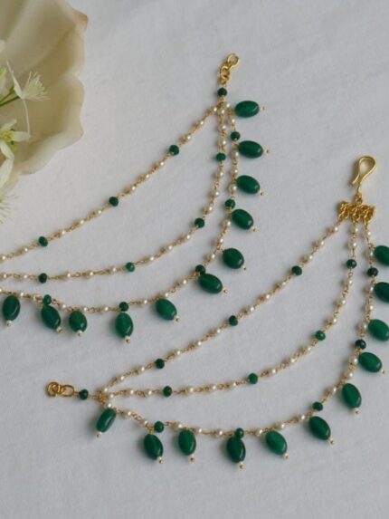 Handcrafted Triple-Layered Pearl Kaanchain | Traditional Gold-Plated Ear Saharas