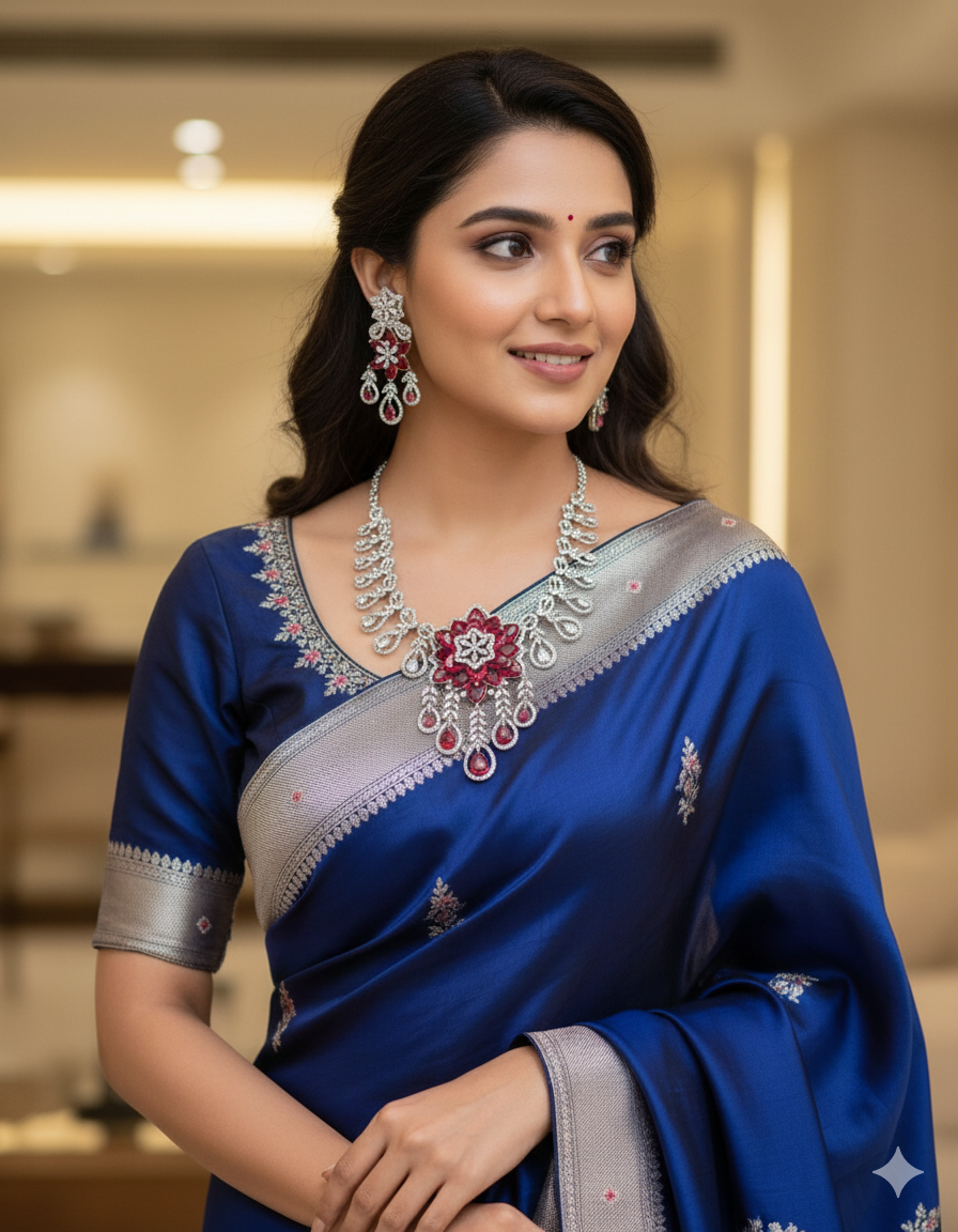 - Exude regal charm with our “Empress” statement set. This masterpiece features a meticulously crafted floral pendant centered with a vibrant lab-created ruby, surrounded by a cascade of brilliant-cut zircons. The matching chandelier earrings mirror the intricate drop design, making it the perfect centerpiece for grand weddings and gala events.