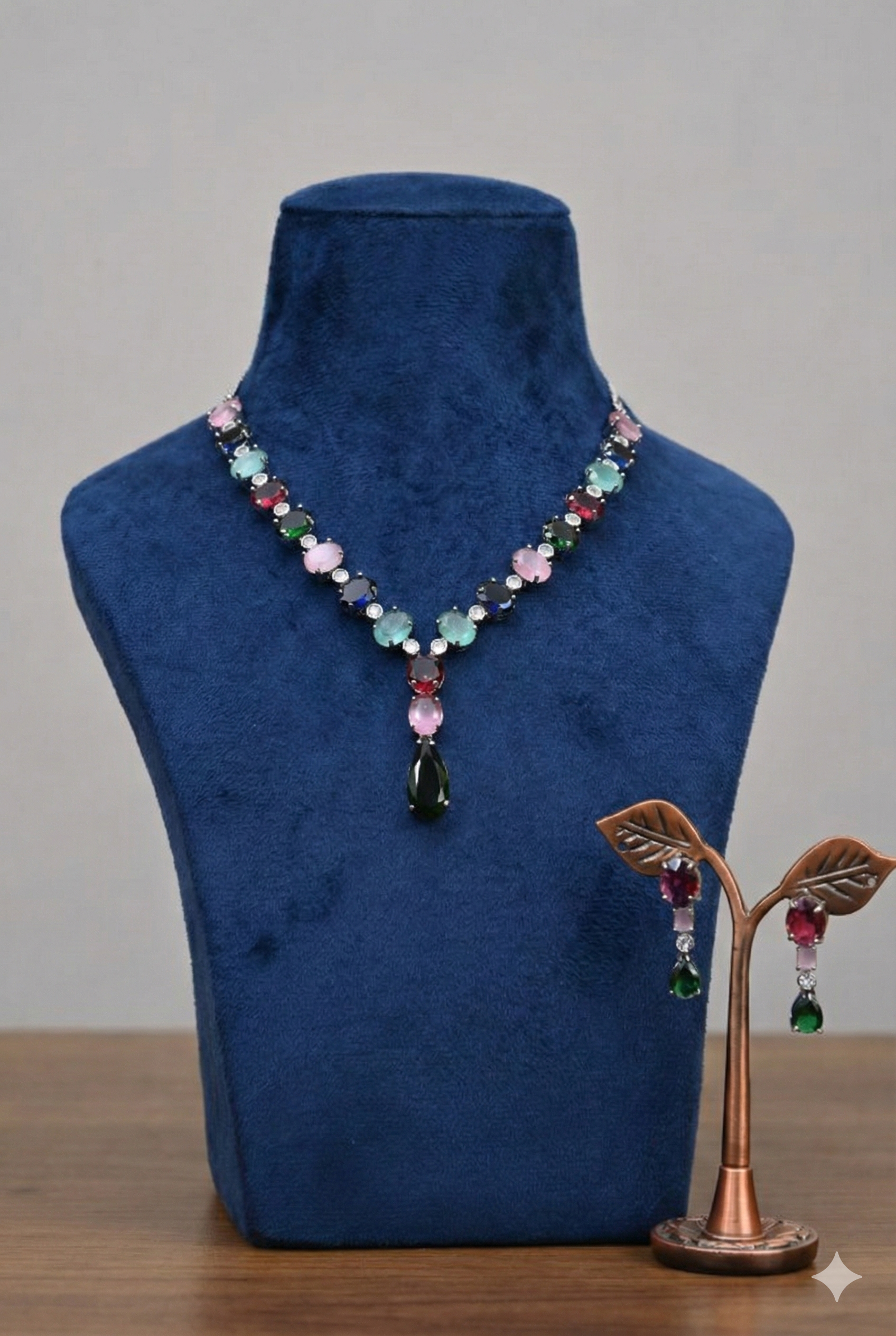 Elevate your evening look with this stunning multicolor necklace set, designed to capture the light from every angle. Featuring a vibrant array of oval-cut stones in ruby red, sapphire blue, emerald green, and soft pink, this piece is a celebration of color and elegance.