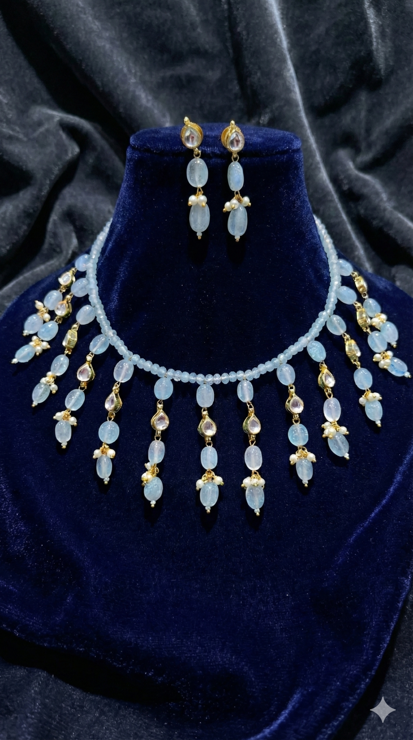 Ice Blue Beaded Kundan Choker Necklace Set with Pearl Accents
