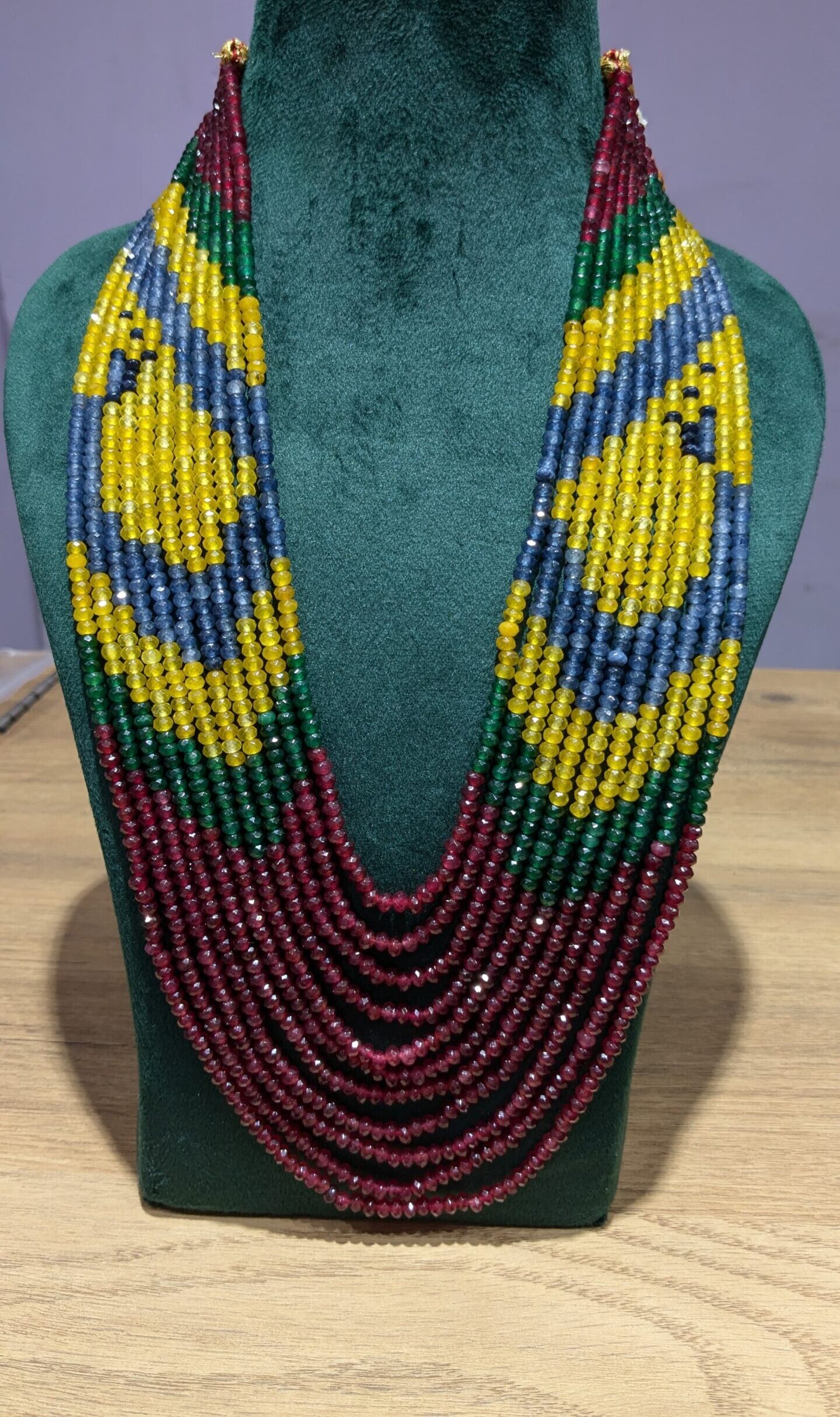 Elevate your ethnic ensemble with this stunning, handcrafted multi-strand mala necklace. This exquisite piece features a rich composition of faceted semi-precious gemstone beads in a striking chevron pattern, showcasing alternating layers of deep ruby red, vibrant emerald green, royal blue sapphire, and radiant yellow sapphire