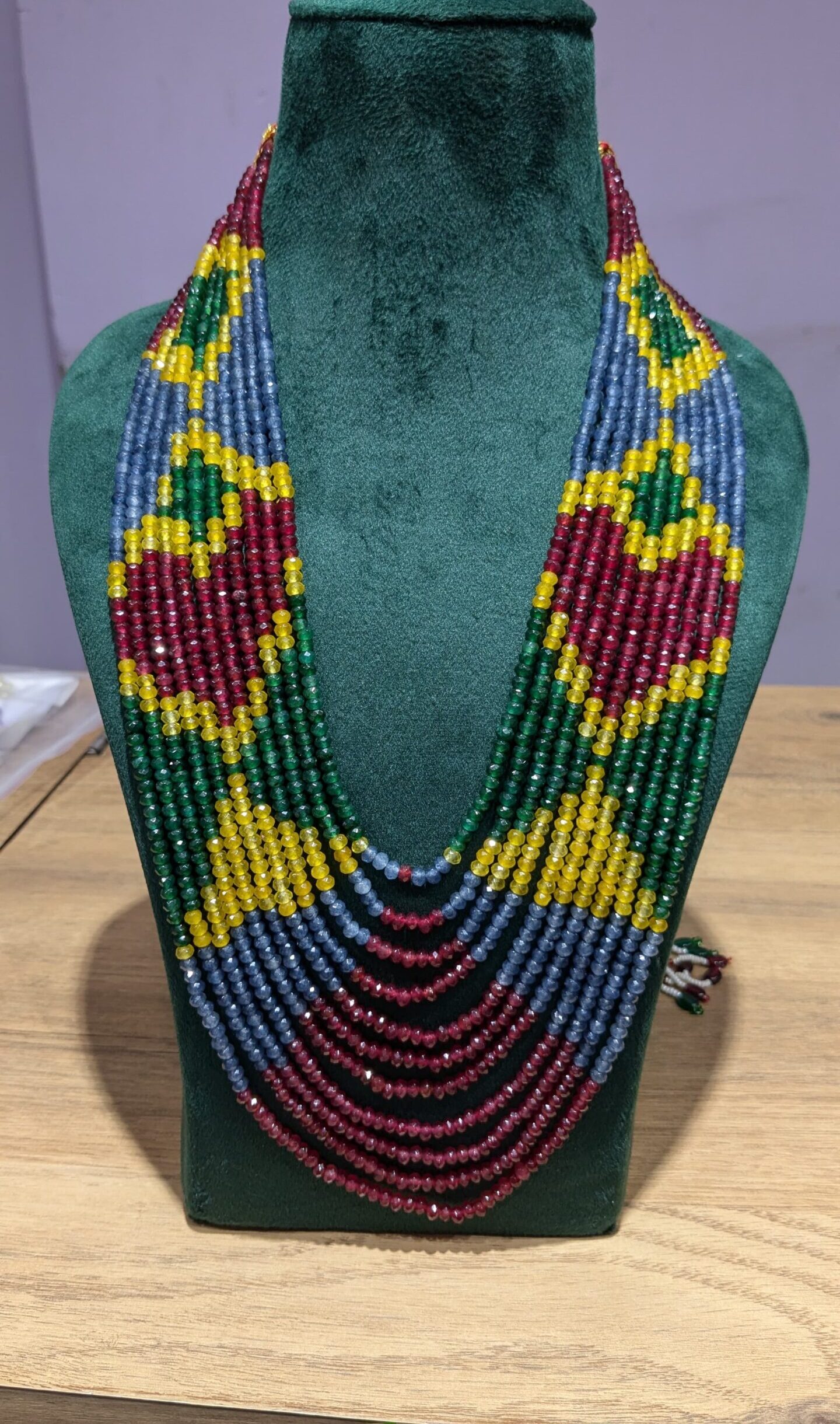 Elevate your ethnic ensemble with this stunning, handcrafted multi-strand mala necklace. This exquisite piece features a rich composition of faceted semi-precious gemstone beads in a striking chevron pattern, showcasing alternating layers of deep ruby red, vibrant emerald green, royal blue sapphire, and radiant yellow sapphire.