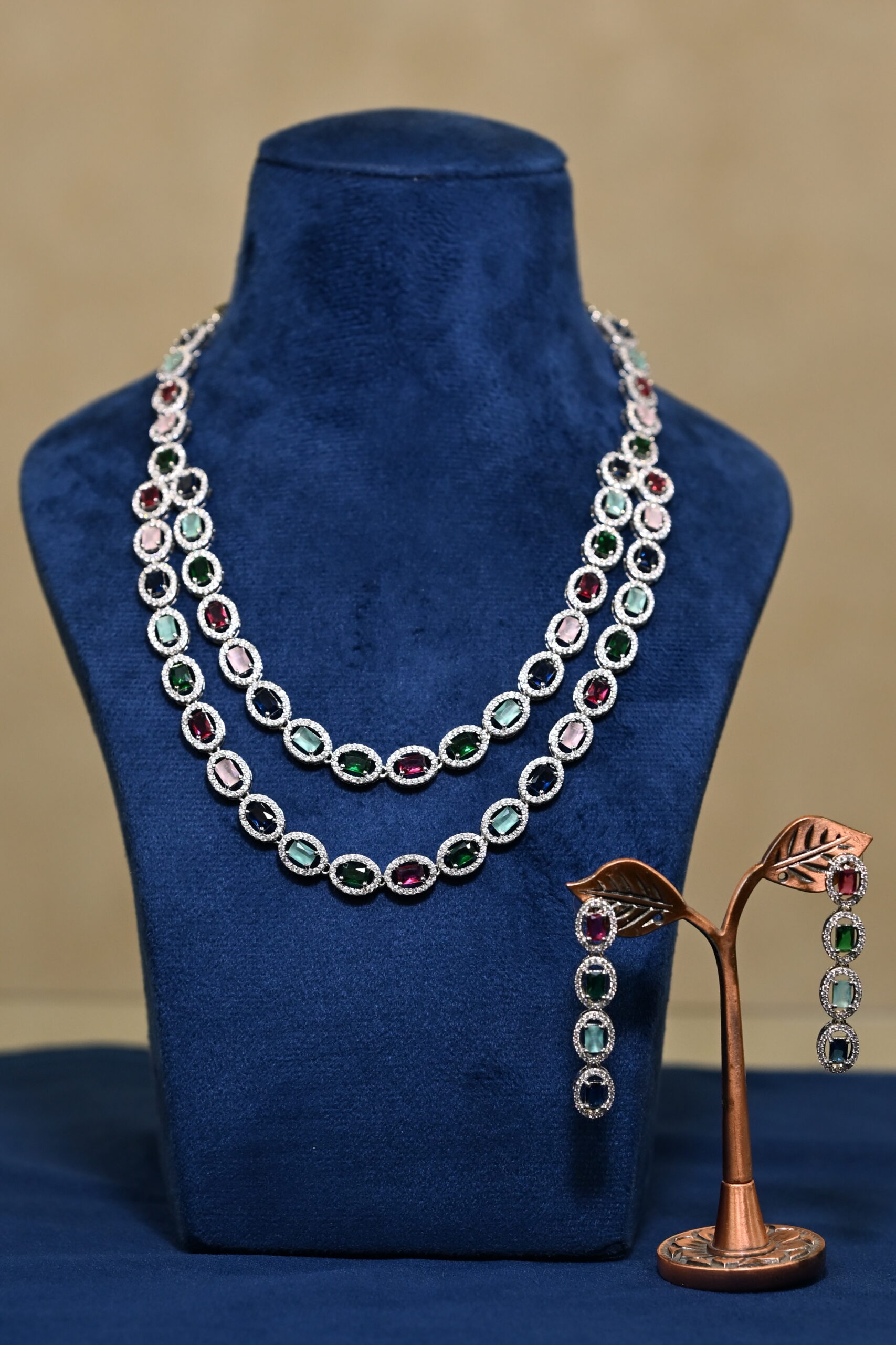 Add a splash of vibrant elegance to your collection with this stunning Multicolor American Diamond Necklace Set. Designed for the modern woman who loves to sparkle, this set features a luxurious double-strand style necklace adorned with high-quality, emerald-cut colored stones.