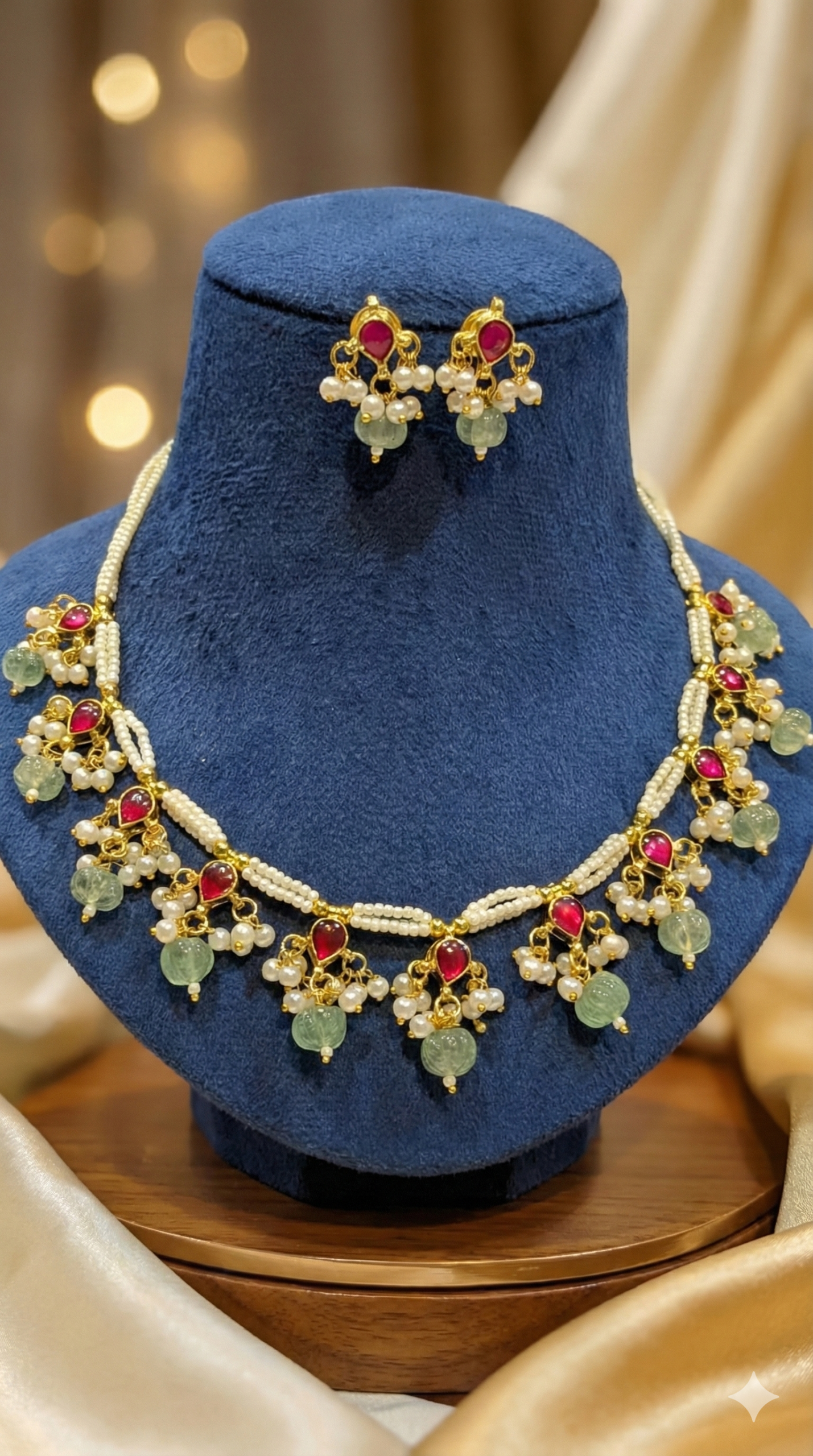 Ruby Red & Mint Green Pearl Choker Necklace Set | Gold Plated