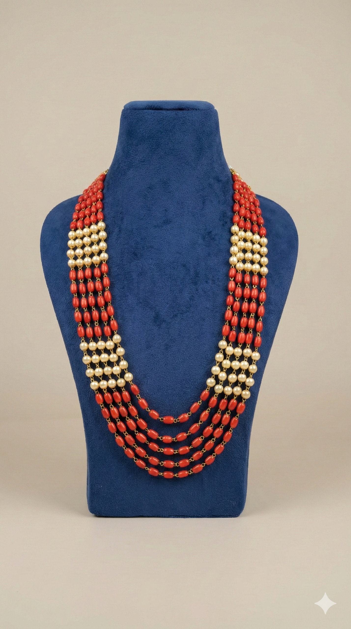 Traditional 5-Layer Coral Red & Pearl Beaded Rani Haar