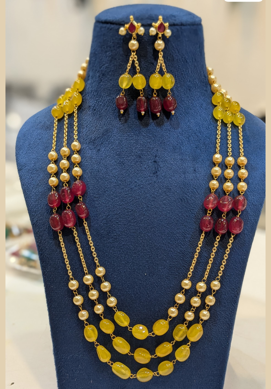Triple Layer Gold Chain and Pink/Green Beaded Necklace Set