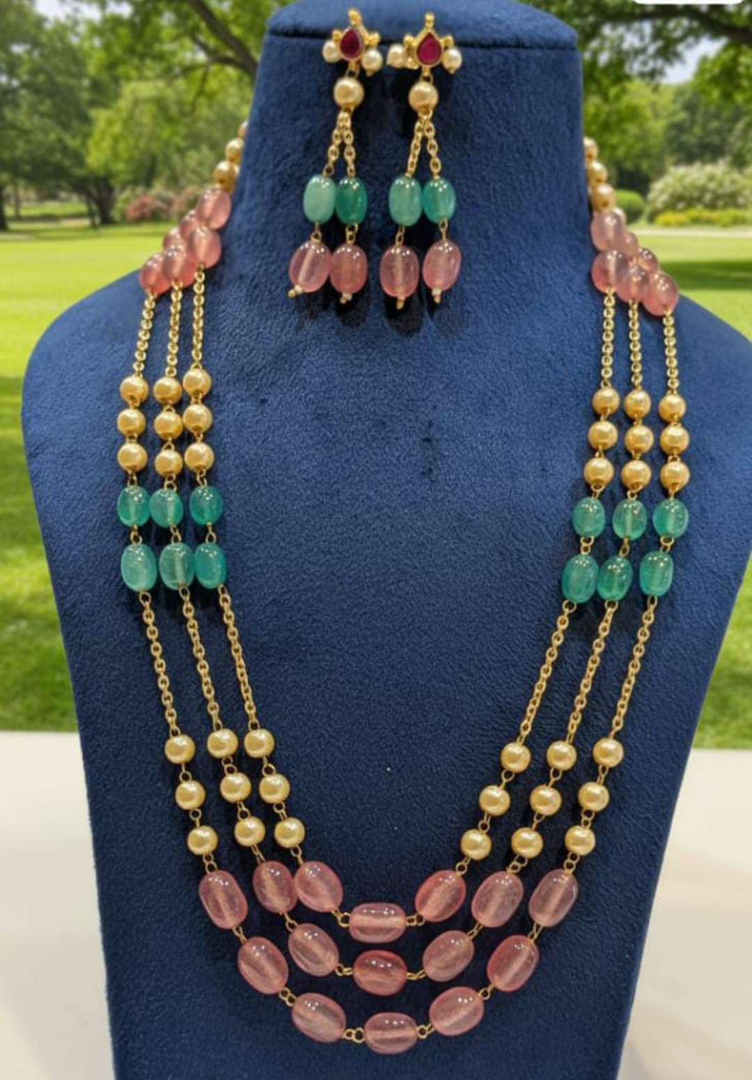 Triple Layer Gold Chain and Pink/Green Beaded Necklace Set